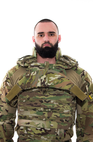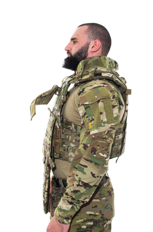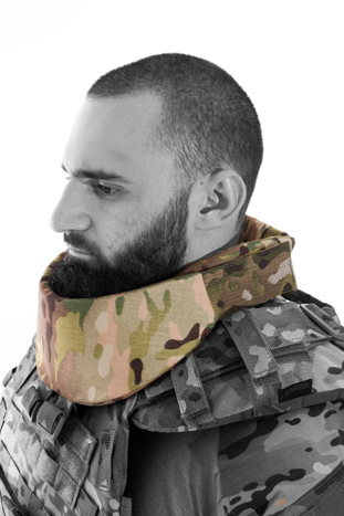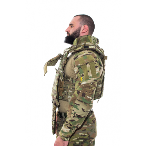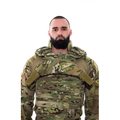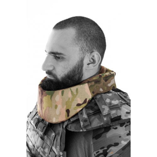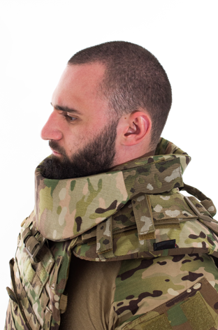 Комір захисту шиї та горла забезпечує круговий протиуламковий захист шиї, шийних хребців та верхньої плечової частини тулуба. Балістичний пакет розташований по всій площині конструкції та кріпиться за допомогою плечових поперечних строп і велкро на плечах та спині. Виготовлений з оригінальної американської тканини Cordura 500D.